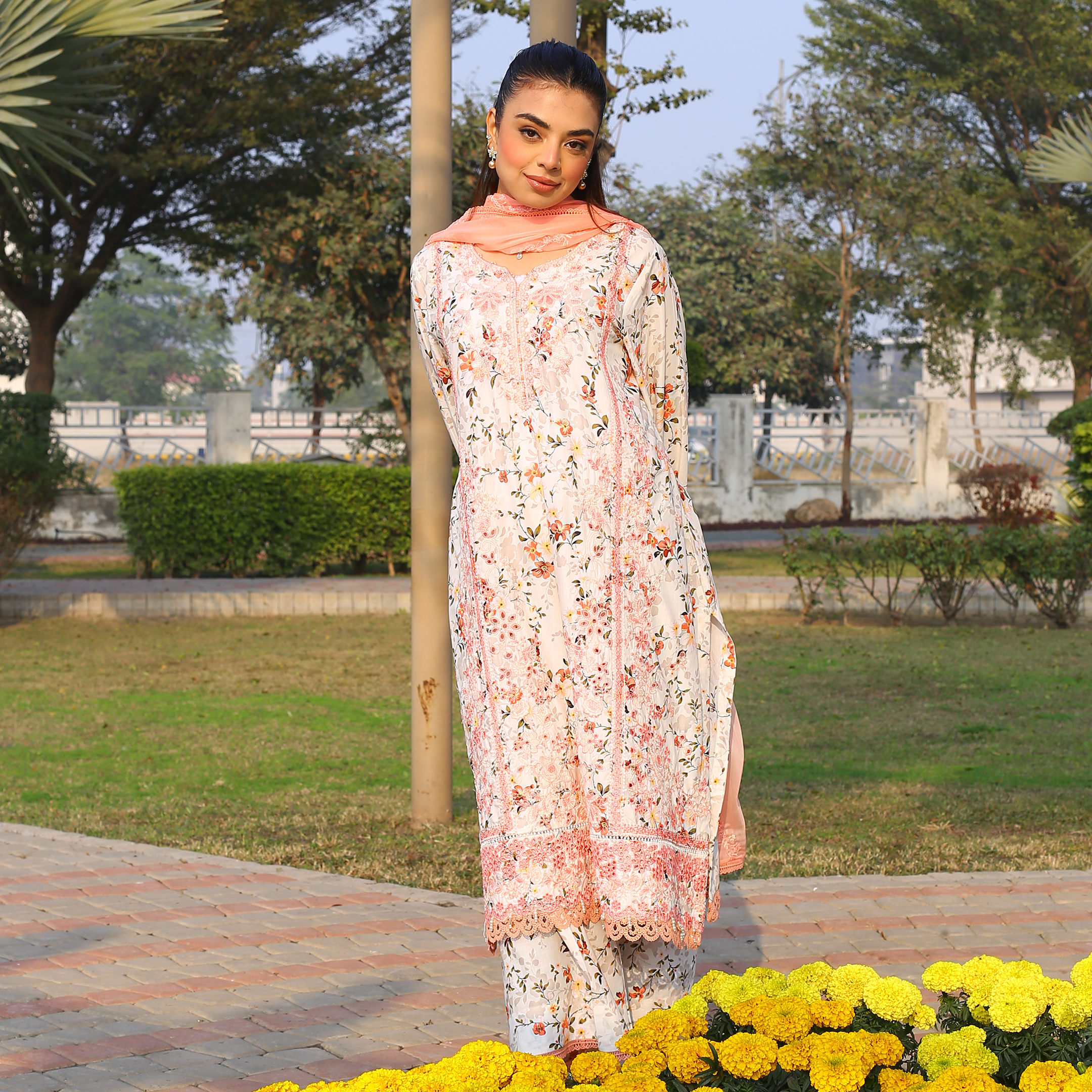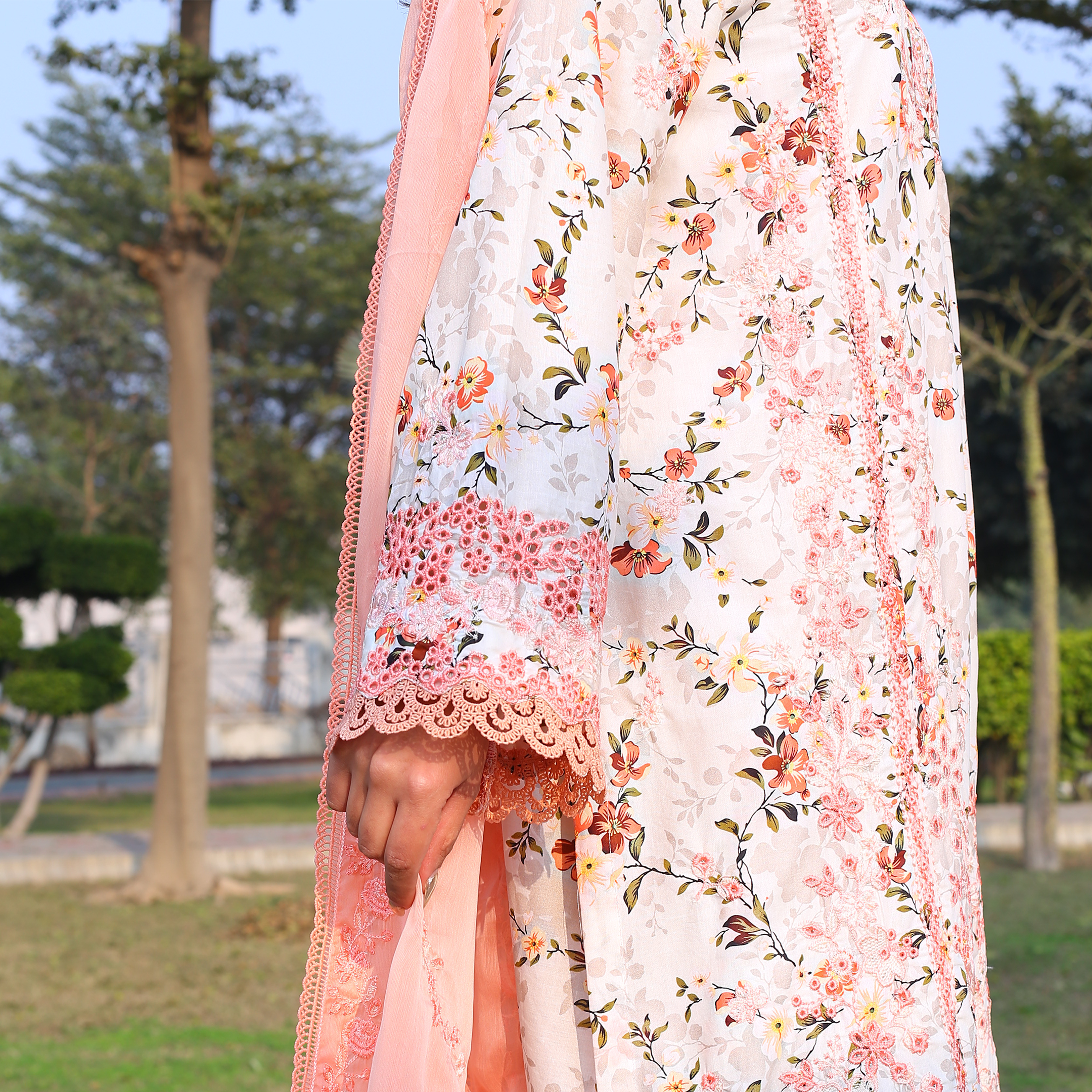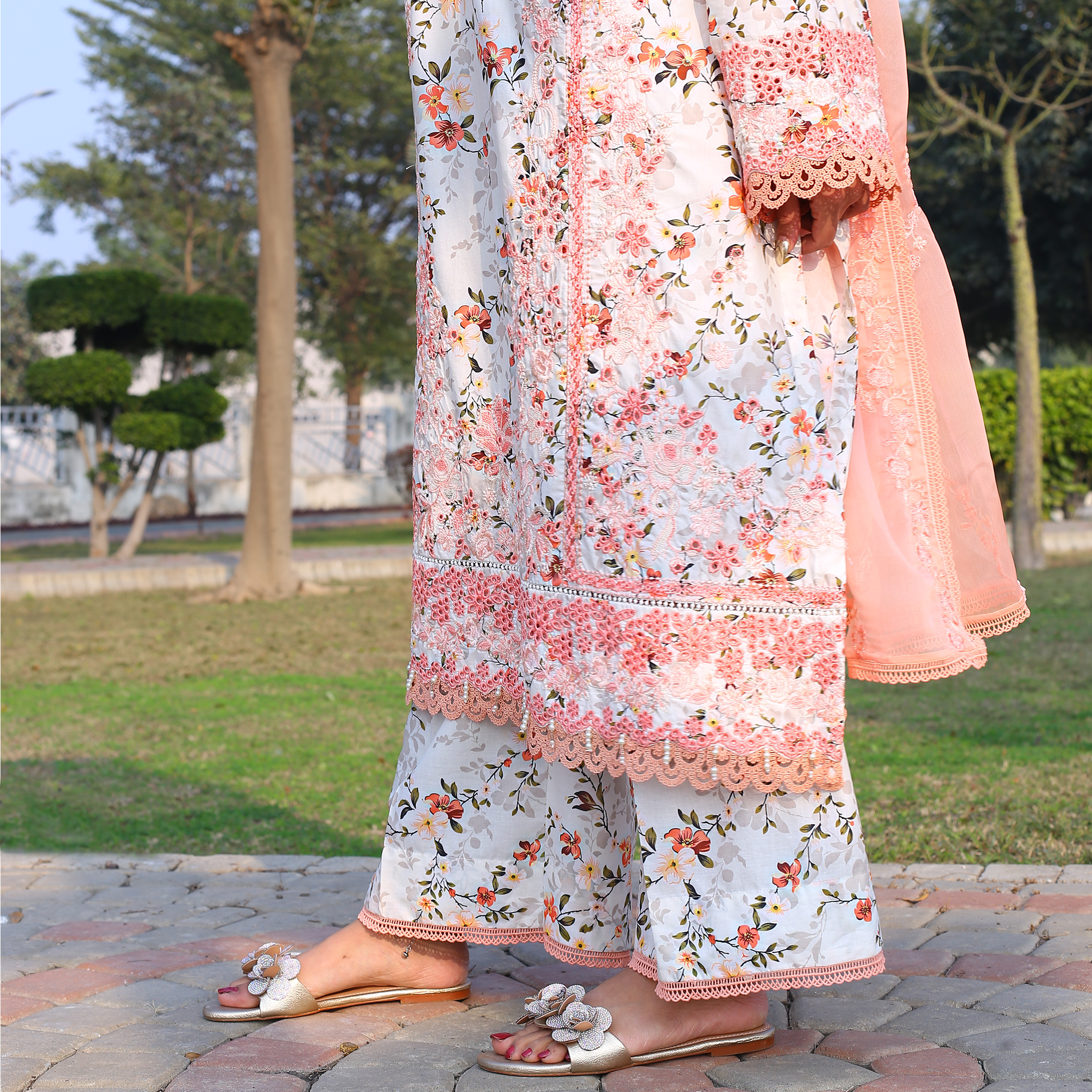 embroidery in off-white and peach hues. The embroidered peach chiffon dupatta adds a luxurious finish, creating